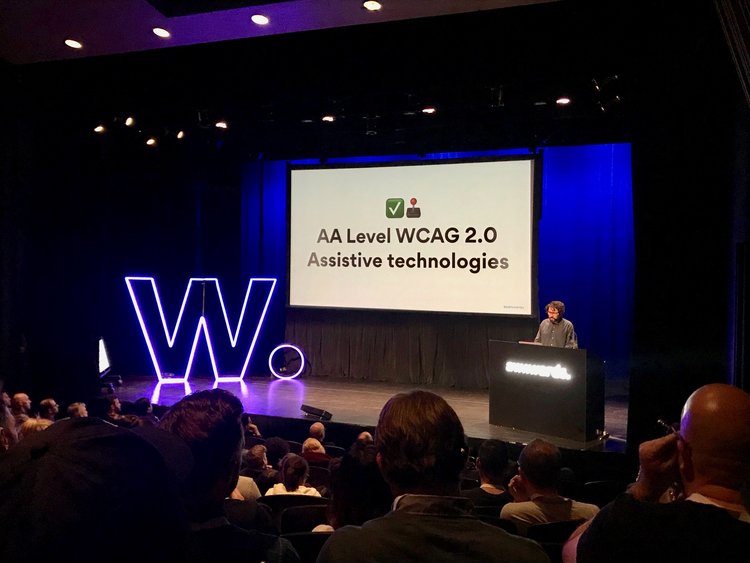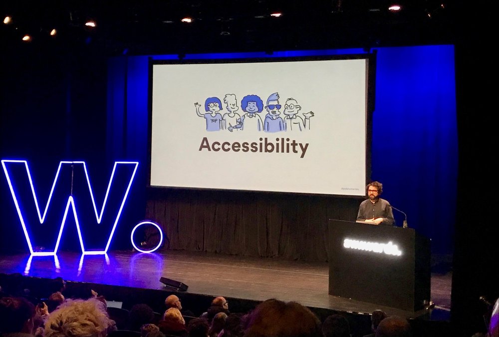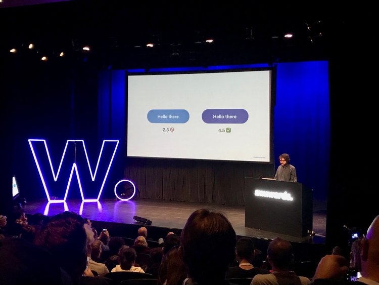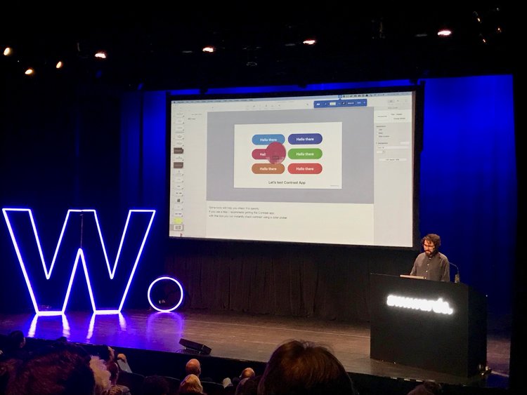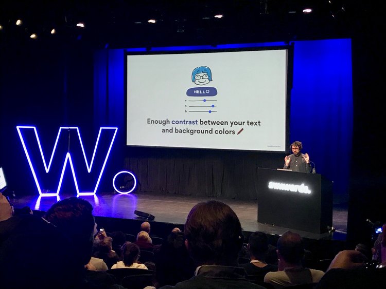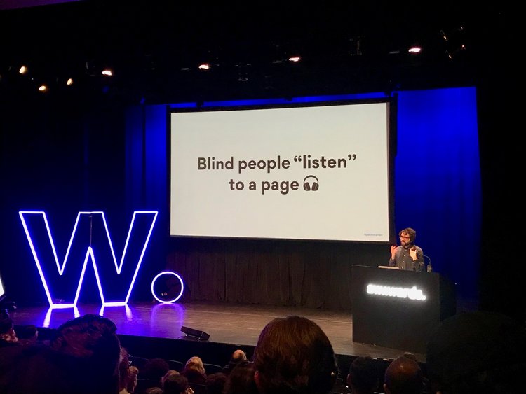 目前在 Invision Studio 擔任設計師的 Pablo Stanley,他的演講大概是我兩天內最喜歡的一場了,演講的主題很明確,就是在談「 網站易用性 Web Accessbility」,身為一名色盲設計師(超佩服)他從他自身的故事開始談起,一開始在Agency做印刷設計時,他的客戶跟他說顏色不是如所討論的那樣,這時他才發現,他看到的顏色跟其他人不同,這開啟他了另一個設計觀點,在我們現在網路的世界裡面,其實有形形色色的人在使用著網路產品,有婦女、老人、小孩,也有殘障,對於先天視力不良的人,他們也還是會使用電子產品,先撇除色盲之外,你可知道大部分全盲的人都是用聽的在使用智慧型手機嗎?
