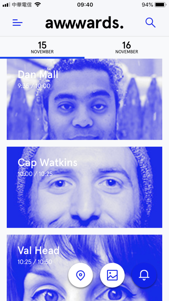 兩天的活動裡,總共有24場演講,來自世界各地的設計師,有企業中的設計管理者,也有知名設計工作室裡的頂尖設計師。像這樣的數位設計活動,Agenda當然也要數為一點,主辦單位這次還做了一個專屬的App,非常方便大家查看每個演講者的資料,介面整個很精心設計!(看的非常開心😄)
