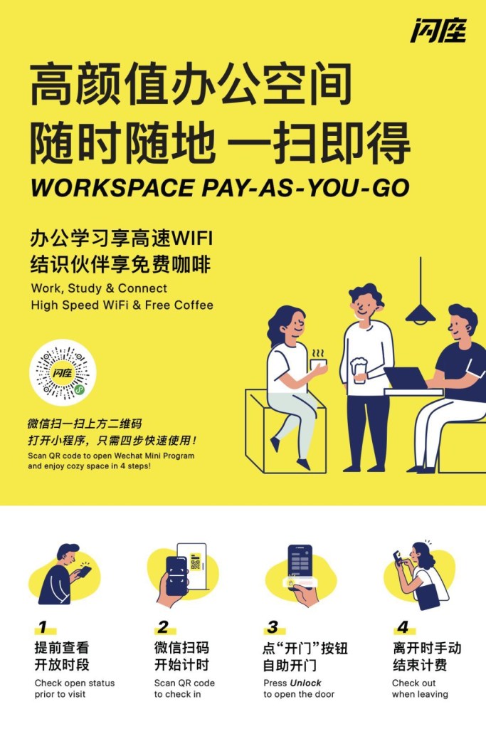 目前在上海有6間WeWork據點(9AM-6PM),跟11家裸心社空間 (24HR) 可以使用閃座服務,無需預約可以直接使用!