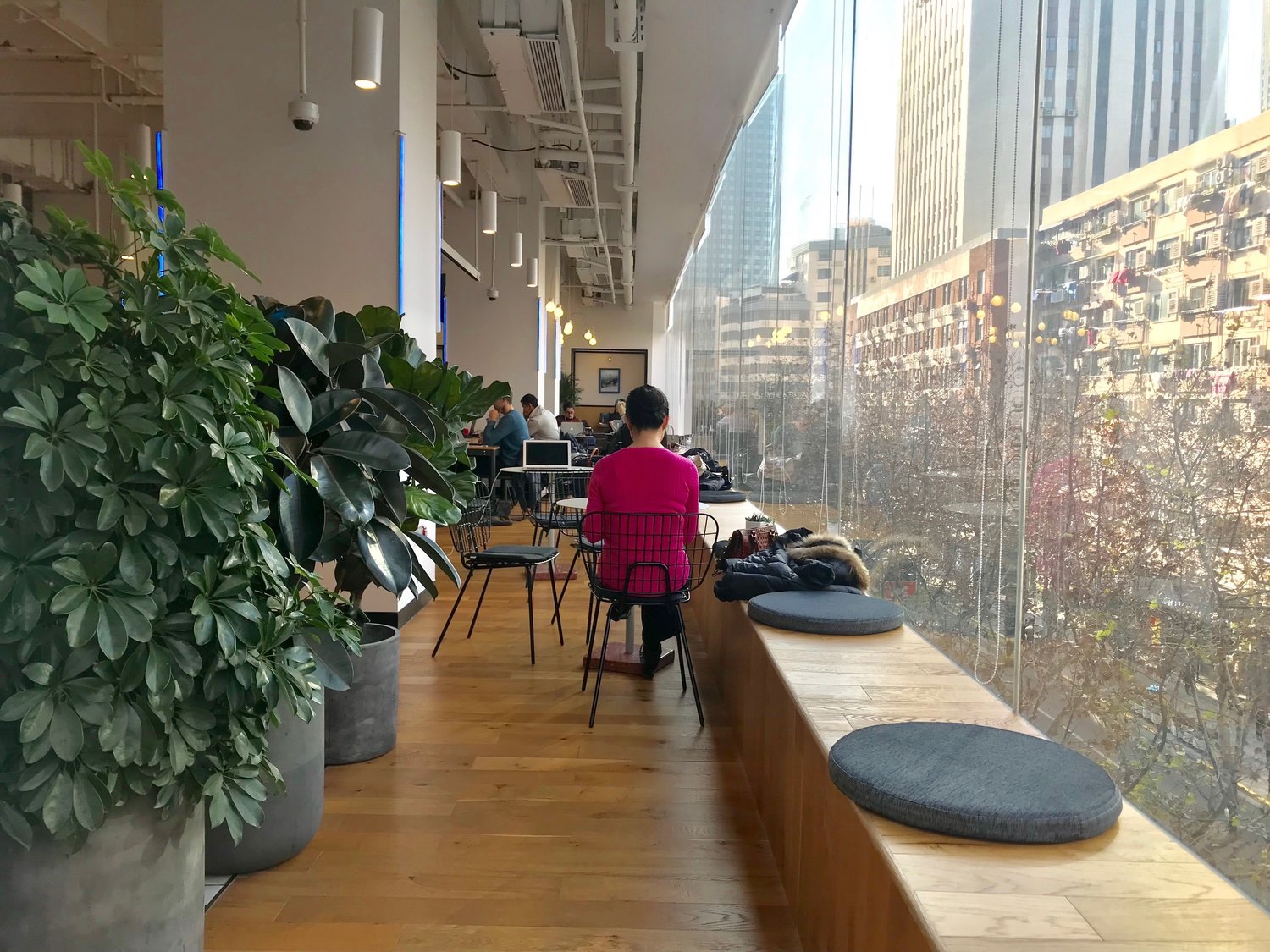 位在南京西路的WeWork有大面的落地窗可以俯瞰南京西路街景,我想秋天時的銀杏樹滿開應該超美!(見下圖)
