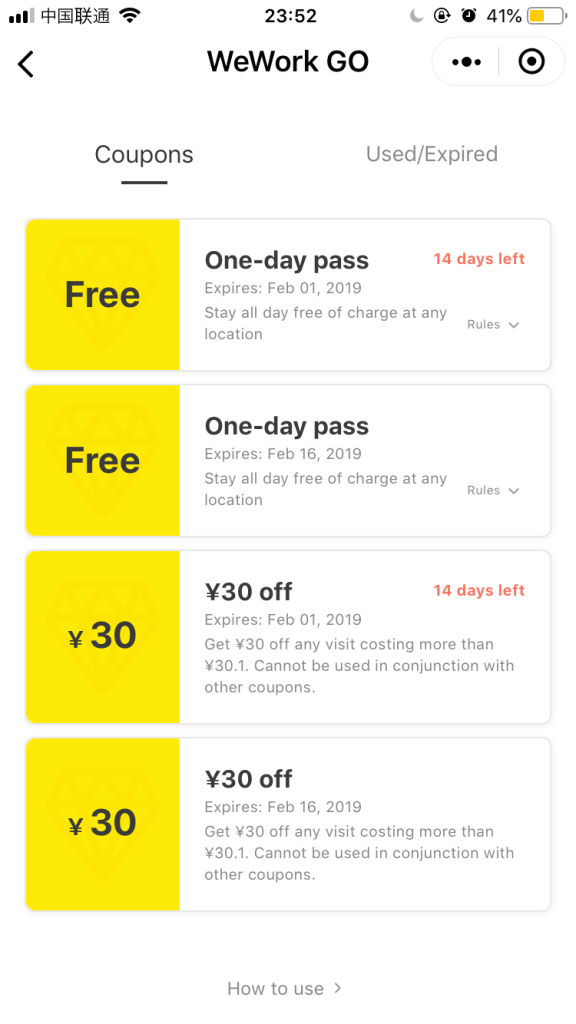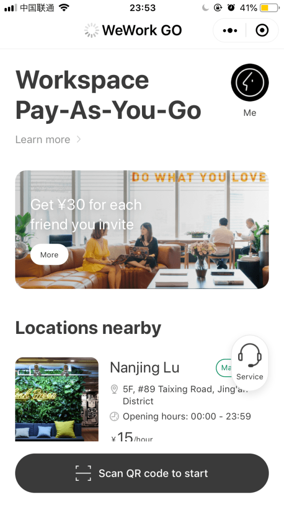 在中國獨有的WeWork Go只需要透過微信註冊,到了地點後解鎖,即用即付,收費每小時15塊人民幣(約一小時75台幣),雖然有些據點是每小時30塊人民幣,但我覺得整體使用起來費用上算是C/P值蠻高的!