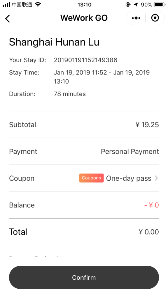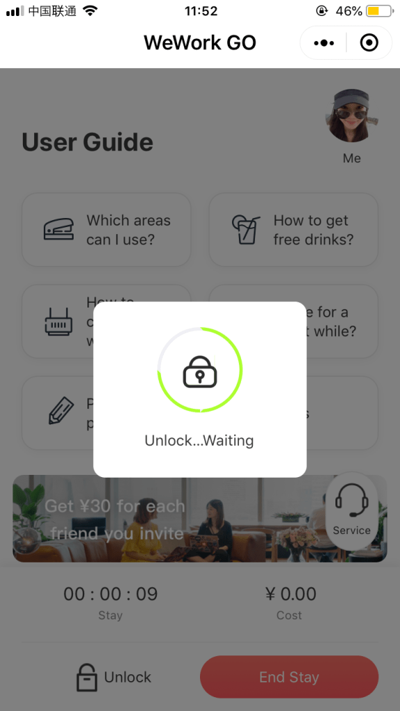 到了WeWork後打開WeWorkGo在微信的介面,掃門上的QR Code 打開門鎖,接著應用程式就會自動開始計時,離開前按結束計時,帳單就會自動產生拉!