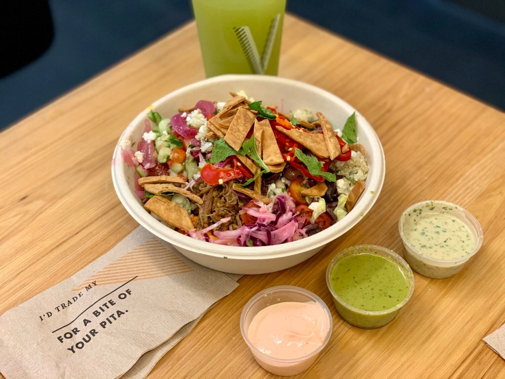 Cava Grill 主打希臘地中海飲食風格,也是一樣一條龍選菜方式,基底除了飯之外,可以選擇配上好吃的Pita麵包,我個人覺得整碗裡面超級加分的就是它最後有個脆脆的配料選項,讓Bowl整體的口感層次更上一層樓~喜歡希臘風的捧油不要錯過囉~
